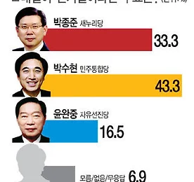 공주시 총선, 민주통합당 박수현, 새누리 박종준에 10%P 앞서 1위 최대 접전지역중 하나인 대전 동구에서 새누리당 이장우 후보와 자유선진당 임영호 후보, 민주통합당 강래구 후보가 오차범위(±4.0%P)내에서 접전을 펼치고 있다. 공주에서는 민주통합당 박수현 후보가 새누리당 박종준 후보에 10%P 차이로 앞서고 있다. 중도일보가 여론조사 전문기관인 충청리서치에 의뢰해 지난 1일 실시한 4ㆍ11 총선 여론조사결과, 대전 동구 선거구에서는 새누리당 이장우 후보가 34.3%의 지지율을 얻어, 현역의원인 자유선진당 임영호 후보의 29.4% 보다 4.9%P 앞섰으며, 민주통합당 강래구 후 보도 26.8%의 지지율로 선두인 이 후보를 7.5%P 차이로 추격하고 있는 것으로 나타났다. 무소속 송유영 후보는 3.4%의 지지율을 기록했으며 모름ㆍ없음ㆍ무응답은 6.1%였다. '차기 국회의원.. 더보기 이전 1 2 3 4 5 ··· 70 다음